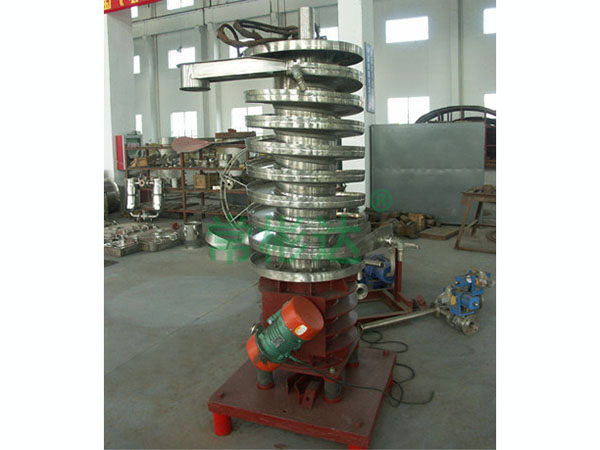 濕物料自頂部加料口進入螺旋床內,在周向激振力及重力的作用下,物料沿螺旋床自上而下作跳躍運動直至最底層;同時,潔凈的熱風由螺旋床底部進入,與分布在床上的物料進行充分的傳熱和傳質后,由頂部排濕口排出。從而使物料達到了干燥的目的。