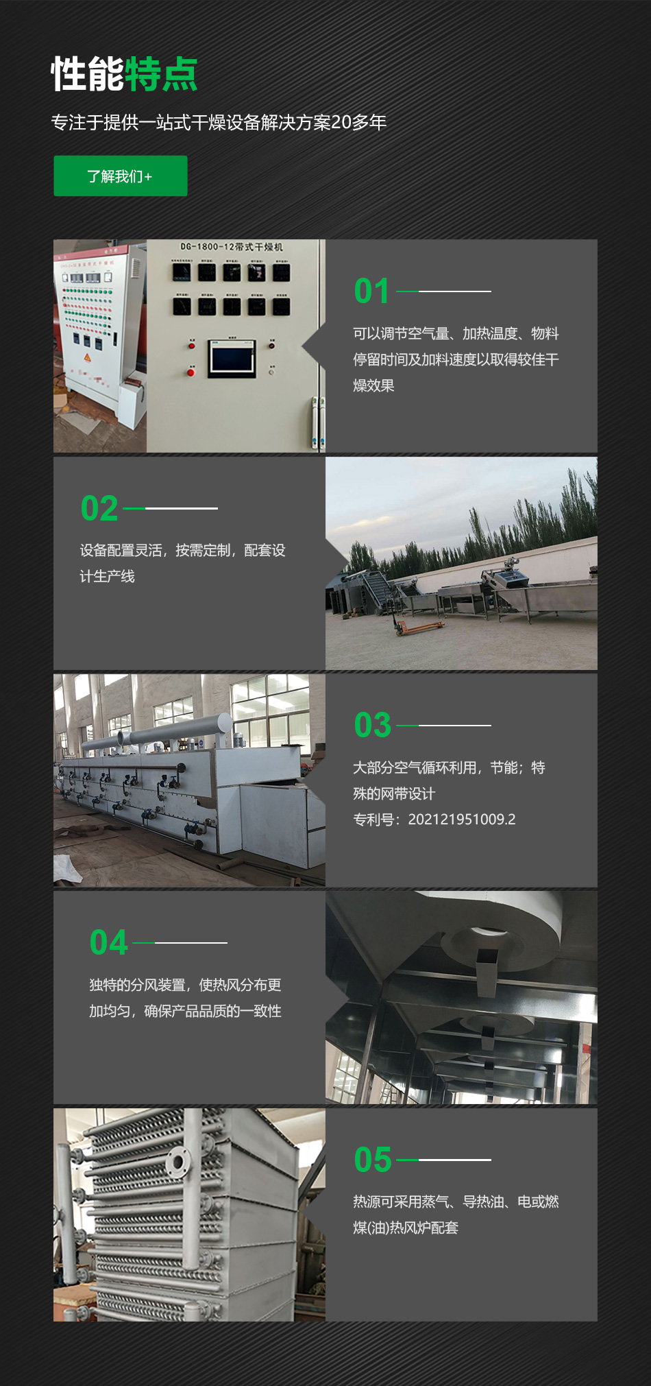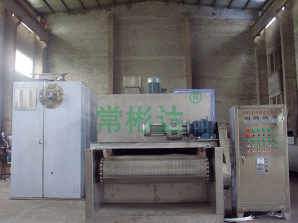 物料由加料器均勻地鋪在網帶上,網帶一般采用12-60目不銹鋼絲網,由傳動裝置拖動在干燥機內移動。干燥機由若干單元組成,每一單元熱風獨立循環,部分尾氣由專門排濕風機排出,廢氣由調節閥控制,熱氣由下往上或由上往下穿過鋪滿物料的網帶完成熱量與質量傳遞的進程,帶走物料水份。網帶緩慢移動,運行速度可根據物料溫度自由調節,干燥后的成品連續落入收料器中。上下循環單元根據用戶需要可靈活配備,單元數量亦可根據需要選取。