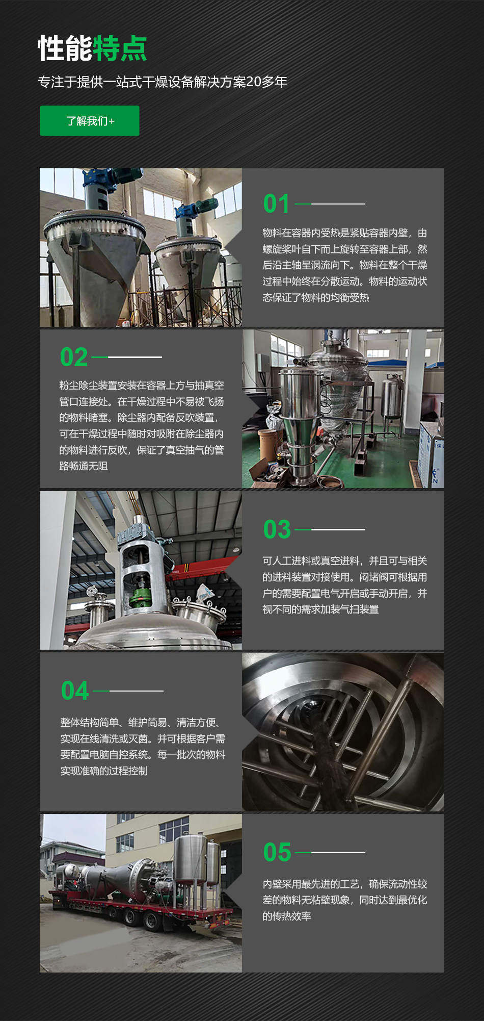 單錐螺帶真空干燥機是一種利用螺帶將物料旋轉提升及圓錐夾套、空心螺帶內同時通入傳熱介質(如熱水、導熱油、蒸汽等),使加熱后物料從四周提升并從中間下落,快速不斷的循環翻轉,并通過筒體內抽真空將水汽及時帶走, 使物料在短時間內達到干燥和混合目的。與傳統的立式混合機相比,筒體內沒有任何傳動機構,從根本上杜絕因潤滑油泄漏而導致物料污染,運行可靠穩定,特別適宜衛生要求高的粉料、顆粒混合;同時也適用于粘性流體或稠狀、濕狀為主物料的攪拌混合;與其它臥式干燥機相比,具有出料方便,可以100%完全出料,操作、維修方便。它的干燥效率是同等規格“雙錐回轉真空干燥機”3-5倍。